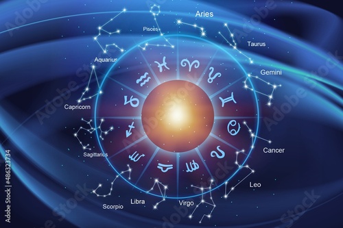 Zodiac signs inside of horoscope circle. Astrology in the sky with stars and moons astrology and horoscopes concept