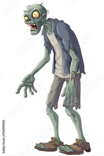 Zombie character in tattered clothing, shambling forward in a spooky, animated style