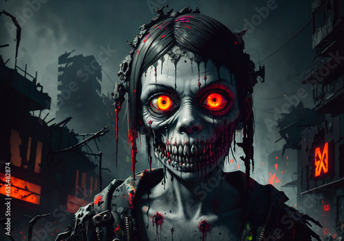 Zombie woman in the city at night. Halloween. Horror. Generative AI.