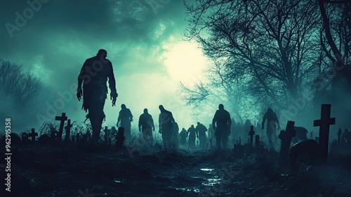 Zombies emerging from their graves on Halloween night