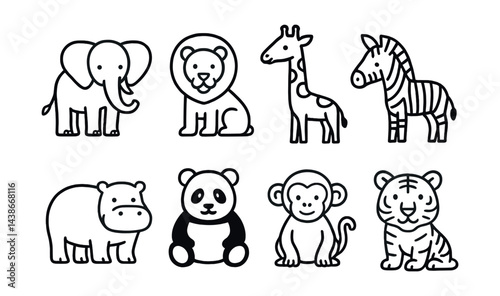 Zoo animals icons set – elephant, lion, giraffe, zebra, hippo, panda, monkey, tiger