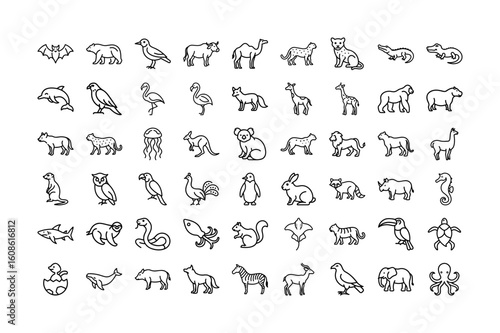 Zoo Animals Vector Icon Set. Bat, Bear, Dolphin, Flamingo, Camel, Lion, Giraffe, Owl, Shark, Elephant, Penguin, Raccoon, Octopus, Zebra, Tiger, Whale, Snake, and More. Editable line Vector icons. .