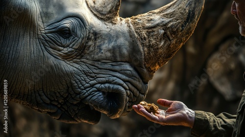 Zoo keeper feeding rhinoceros at wildlife sanctuary close-up photography natural habitat animal care concept