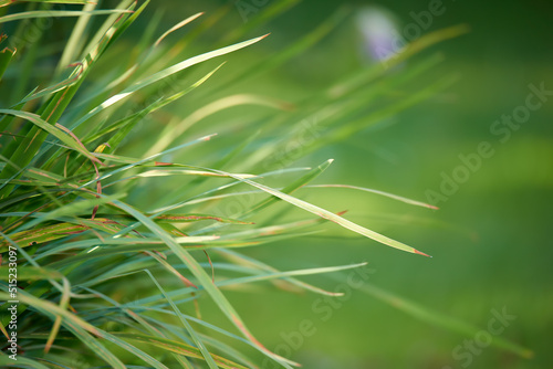 Zoom on fresh grass growing on a field or park on a sunny day. Long, untrimmed lawn in need of a cut or maintenance. Fresh wild spring grass growing outside. Uncut nature wallpaper with copyspace