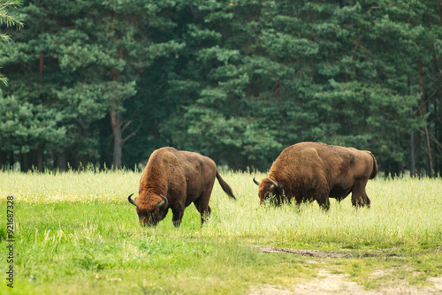Żubry z dzikiej starej Puszczy Białowieskiej piękne potężne zwierzęta