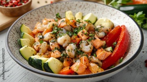 Zucchini Bell Peppers Salmon and Calamari Medley with Fresh Herbs