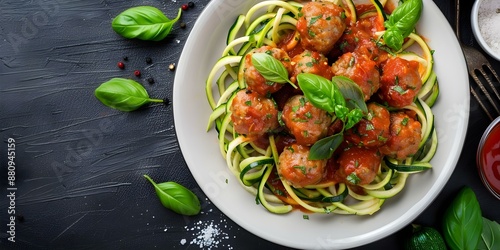 Zucchini Noodle Meatballs in Tomato Sauce. Concept Vegetarian Meatballs, Zucchini Noodles, Homemade Tomato Sauce, Healthy Dinner, Italian Cuisine
