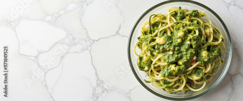 Zucchini Noodles with Pesto Sauce in a Clear Bowl on a Marble Countertop