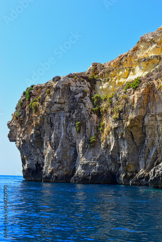 ZURRIEQ, MALTA - Augusts 06, 2021: The Blue Grotto - A famous sea cave surrounded by the deep blue sea at southern Malta. On a traditional boat surrounded by more brightly coloured boats. On a hot day