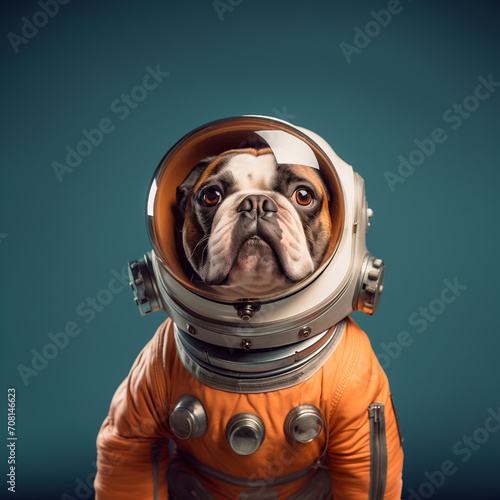 bulldog, astronaut, costume, pet, adorable, space, helmet, dress-up, animal, humor, concept, fantasy, pose, serious, expression, grey background, suit, orange, science fiction, fiction, creative, playful, unique, dog, portrait, studio, photo, fun, character, exploration, canino, domestic, astronaut, outfit, imaginative, role-play, space-travel, mascot, whimsical, generative, aiSHARE