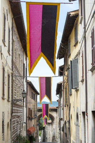 cagli, europa, italy, marches, pesaro, urbino, architecture, blue, building, city, colours, day, exterior, flag, historic, house, italian, old, photo, red, street, typical, urban