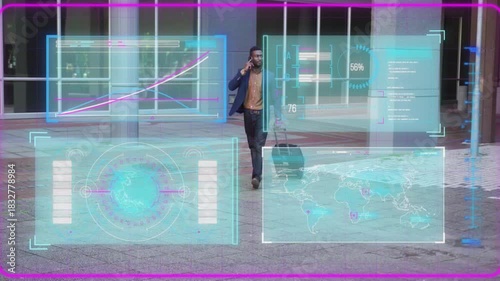 Acrylic Prints: Executive walking forward talking on phone towing suitcase, call causing holographic map over him