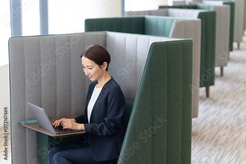 booth, woman, business, telecommuting, workspace, personal computer, suit, japanese, asian, surround, concentration, notebook, office, corporation, equipment, meeting, meeting, work, work, desk, isolation, 1, computer, businesswoman, woman, people, person, cyberspace, technology, table, professional, corporate, typing, look, information, soundproof, smile, smartphone, compartmentSHARE