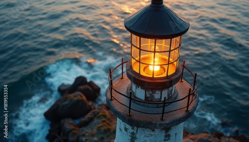 lighthouse, ocean, light, dusk, wave, guidance, safety, serene, twilight, coastal, beacon, maritime, rock, illumination, nature, calmness, scenic, adventure, exploration, nautical, evening, beauty, landscape, calm, horizon, warm light, seascape, peaceful, guiding light, romantic, atmosphericSHARE