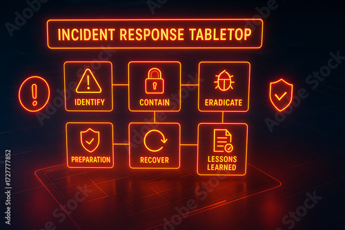 incident, response, tabletop, neon, glowing, illustration, cyber, security, training, workflow, preparation, identification, containment, eradication, recovery, lesson, learned, digital, risk, management, concept, awareness, compliance, defense, firewall, safeguard, hacking, protection, phishing, vulnerability, infrastructure, crisis, strategy, resilience, prevention, governance, system, breach, technology, operation, monitoringSHARE