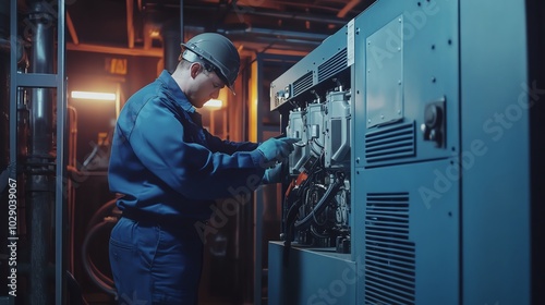 Acrylic Prints: Technician repairing industrial machinery in a dimly lit environment.