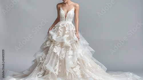 wedding, gown, bride, lace, dress, fashion, elegant, formal, bridal, beautiful, white, tulle, skirt, intricate, detail, studio, plain, background, tiered, design, stylish, feminine, full-length, chic, romantic, sophisticated, luxurious, celebration, marriage