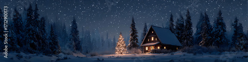 panoramic, lit, scene, christmas, snowy, festive, nature, winter, wood, tree, landscape, holiday, cabin, forest, rustic, sparkling, quiet, cold, iced, warm, evening, family, evergreen, scenic, tradition, picturesque, remote, cosy, white, night, calm, serene, star, decoration, peaceful, wooden, shelter, fir, glow, light, beautiful, celebration, pine, tranquilSHARE