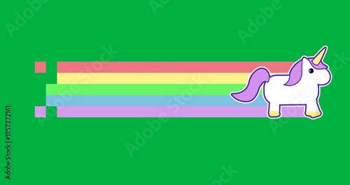 rainbow, unicorn, red, yellow, green, blue, purple, white, black, pony, horse, walking, leaving, behind, cartoon, cute, pretty, lovely, gay, happy, legendary, creature, magical, copy space, chroma key, screen, footage, adorable, positive, alpha, template, editable, transition, green backgroundSHARE