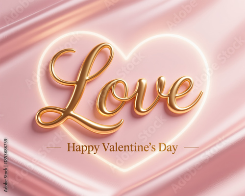 Duvet Covers: Valentines Day illustration with golden cursive love text surrounded by glowing heart on pink satin background with elegant typography and soft lighting effects.