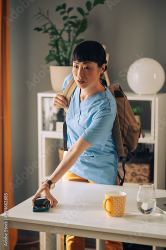 asian, woman, nurse, doctor, home, leaving, house, rushed, essential, blue, scrub, bag, phone, quick, ready, work, table, hot drink, glasses, shelf, minimalistic, health care, health, environment, departure, hurry, professional, item, tool, punctuality, day, hospital, time, effort, simple, morning, lifestyle, move, pace, modern, energy, preparation, multitask, routineSHARE
