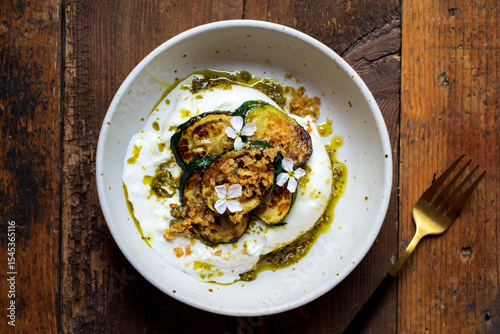 Framed Prints: Burrata with pesto, grilled courgettes, crispy garlic breadcrumbs and radish flowers
