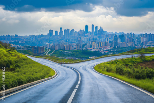 road, city, skyline, splitting, direction, choice, future, path, journey, travel, business, success, opportunity, challenge, decision, crossroad, landscape, urban, destination, city landscape, transportation, highway, asphalt, street, way, route, drive, sky, cloud, day, sunny, green, grass, modern, architecture, building, tower, nobodySHARE