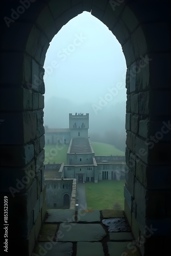 Framed Prints: Gothic Stone Arch Framing White Castle Complex in Dense Fog - Medieval Fortress Atmospheric View