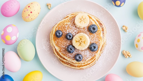 Galaxy Cases: A kid-friendly bunny pancake breakfast with blueberries and bananas, surrounded by pastel polka-dotted eggs on a clean white table.
