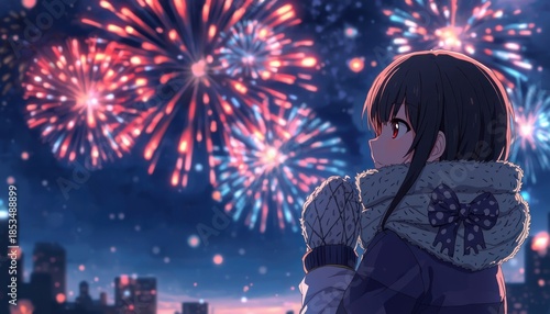 hi-res, fireworks display, anime, wallpaper, girl, fireworks, foulard, mitten, winter, cosy, night, display, colourful, art, illustration, digital artwork, desktopSHARE