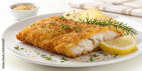 Galaxy Cases: Golden-brown breaded fish fillets, served with lemon wedges and fresh rosemary on a white plate