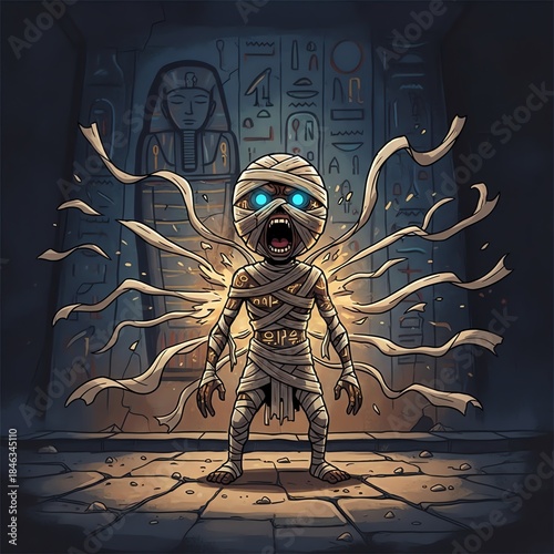 mother, egypt, tomb, ancient, egyptian, pharaoh, hieroglyph, bandage, wrapping, curse, undead, skittish, creepy, scarey, monster, creature, horror, mystical, magical, supernatural, aethereal, glow, glowing, blue, eye, open, mouth, screaming, wailing, energy, radiating, ribbon, flowing, dramatic, stone, floor, ruin, dark, shadow, interior, wall, carving, statue, sarcophagus, character, illustration, cartoon, artSHARE