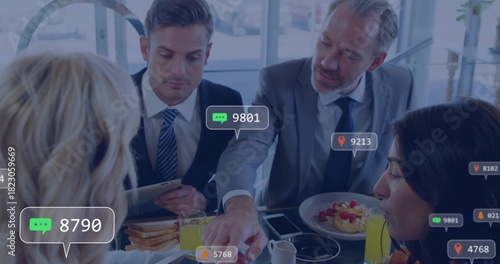 executive, suit, meal, lounge, tablet, badge, boardroom, breakfast, collaboration, professional, daylight, modern, device, colleague, office, glasses, table, window, urban, team, meeting, discussing, seated, reaching, gesticulate, listening, conversing, sharing, eating, focused, engaged, attentive, formal, tailored, adult, senior, man, woman, blond, white, european, smartphone, plate, toast, fruit, juice, overlay, iconSHARE