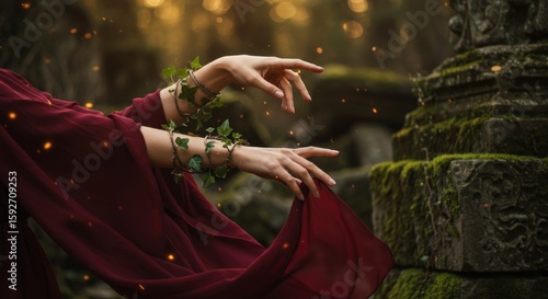 priestess, ritual, forest, druid, hand, closeup, magic, mystical, nature, pagan, spiritual, ceremony, sacred, energy, timberland, earth, leaf, moss, candle, herb, robe, ancient, tradition, belief, female, finger, gesture, connection, meditation, power, spell, wild, green, light, shadow, peaceful, mysterious, root, infuriated, branch, enchantment, silence, atmosphere, faith, closeup, freshness, aspiration, thumbSHARE