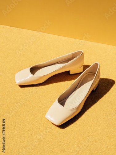 shoe, flats, ballet, footwear, yellow, pale, beige, cream, shiny, glossy, leather, square, toe, fashion, style, minimalist, simple, elegant, classic, studio, shot, still, life, background, object, pair, casual attire, dressy, formal, low, heel, neutral, colours, aesthetic, design, surface, light, shadow, contemporary, modern, texture, smooth, indoor, product, presentation, display, female, summer, springSHARE