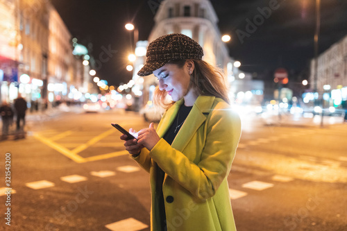 woman, smartphone, city, night, road, caucasian, alone, 1, people, young, group, travel, outdoors, journey, female, holiday maker, traveler, urban, coat, yellow, crossroad, text messaging, house, public transport, reading, wireless, checking, confidence, portrait, message, information, smiling, accessibility, orientation, illuminated, happiness, informing, light, connection, mobility, technology, mobile phone, textingSHARE