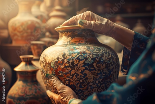 antique, restorer, delicately, clean, vase, overhead, light, emphasize, intricate, closeup, ancient, orient, background, art, sharpen, concept, vintage, classic, fragile, beauty, hand, pattern, detail, subtileSHARE