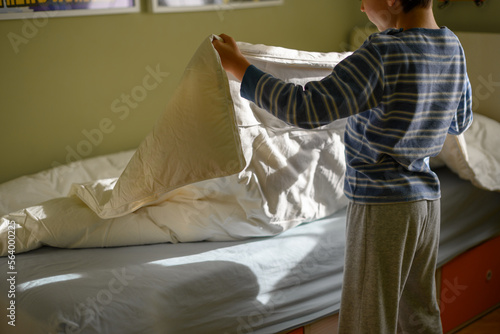 boy, children, elementary, bed, room, constructed, quilt, bedchamber, son, independence, lifestyle, domestic, housework, home, chore, education, learn, indoor, horizontal, 1, people, whiteSHARE