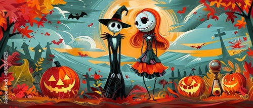 halloween, illustration, jack, sally, autumn, pumpkin, leaves, skittish, whimsical, festive, eerie, cemetery, artwork, sky, haunt, house, cute, costume, star, candy, enchant, shadow, story, charming, night time, ghoulish, lantern, fun, season, moonlight, whimsy, black, art, creepy, cat, design, cartoon, funny, goblin, gothicSHARE