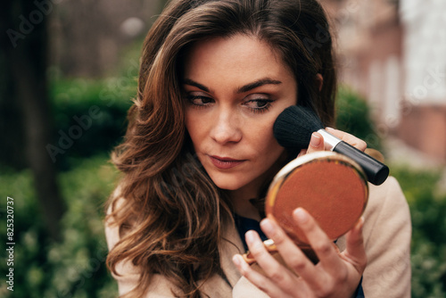 appearance, application, apply, attention, beauty, reddening, brush, calm, compact, complexion, cosmetic, detail, elegance, enhancement, expressive, face, facial, fashion, sharpened, foliage, foundation, fresh, grooming, hand-held, individual, lifestyle, looking, make-up, mirror, natural light, powder, preparation, routine, skincare, style, thoughtful, touch-up, urban setting, vanity, woman, youngSHARE