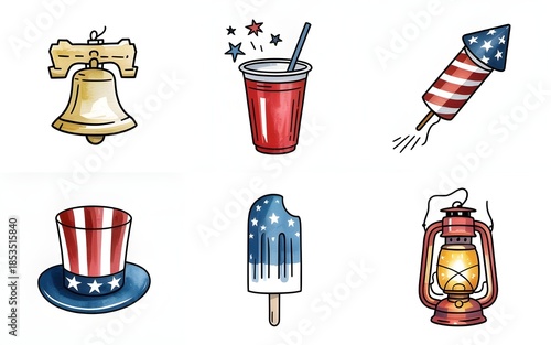 patriotism, america, celebration, independence, freedom, fourth, july, holiday, symbol, bell, liberty, cup, drink, star, fireworks, rocket, hat, uncle, sam, popsicle, lantern, stripes, red, white, blue, festive, historic, event, icon, design