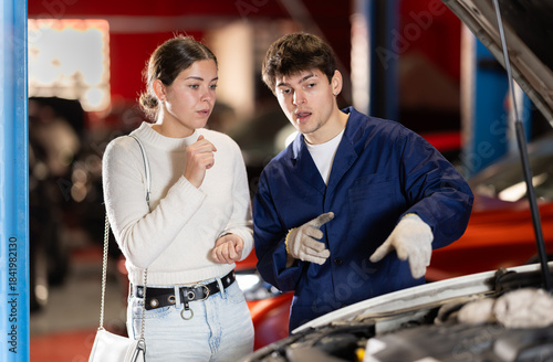 transport, woman, female, man, male, talking, european, american, shop, indoor, equipment, vehicle, working, men at work, repairing, repair, service, mechanic, repairman, uniform, job, upgrade, garage, workshop, station, car, machine, auto, automobile, engine, fix, gear, maintenance, transportation, tool, checking, control, client, client, consult, advise, 20s, 30sSHARE