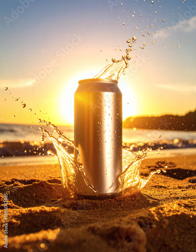 Metal Prints: Blank Aluminum Drink Can with Water Splash at Golden Hour Beach