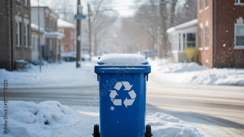 bin, recycling, snow, street, neighbourhood, house, tree, winter, snowy, blue, white, reusing, symbol, cover, falling, peaceful, quiet, dusting, street light, driveway, household, residential, season, weather, communitySHARE