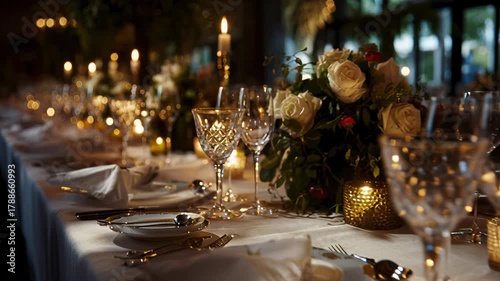 candlelight, centrepiece, crystal, table, wedding, glasses, elegant, reception, luxury, intimate, floral arrangement, place setting, fine diningSHARE
