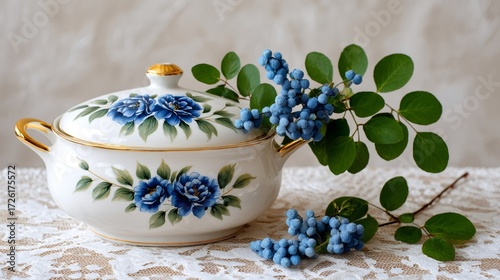 still life, porcelain, blue flower, berry, vintage, elegant, lace, tableware, decor, decorative, traditional, classic, antique, china, ceramic, ornate, floral, pattern, painted, kitchen utensile, container, home decor, interior, retro, old-fashioned, delicate, beautiful, art, design, artistic, formal, luxury, object, nobody, studio shot, horizontal, light background, white, blue, green, gold, texture, comfort, celebration, eventSHARE