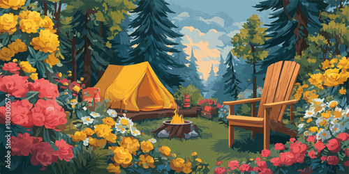vector, balefire, forest, nature, camping, exterior, countryside, grass, pine, yellow, red, green, relax, vacation, summer, spring, adventure, leisure, forest, vegetation, illustration, travelSHARE