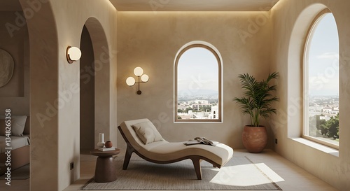 interior, chaise lounge, minimalist, room, home decor, interior design, real estate, furniture, lifestyle, apartment, easy-chair, arch, window, rug, basket, vase, pillow, cushion, warm light, shadow, indoor, home, daytime, serene, calm, peaceful, minimal, modern, elegant, natural, earthy, warm, cosy, architecture, design, tranquil, relaxingSHARE