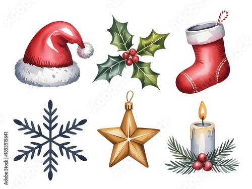 christmas, holiday, festive, decoration, season, winter, santa, hat, holly, berry, stocking, snowflake, star, ornament, candle, light, pine, watercolor, illustration, element, celebration, traditional, merry, december, design, christmas, greeting, graphic, snowSHARE