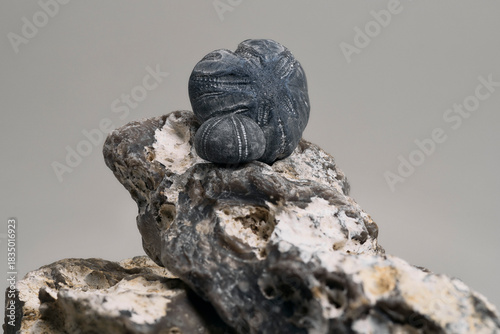 horizontal, animal, closeup, color image, cretaceous, fossil, geology, grey background, mollusc, nature, no people, photo, ocean life, sea urchin, sphere, still life, studio shot, textured effect, two objects, unknownSHARE